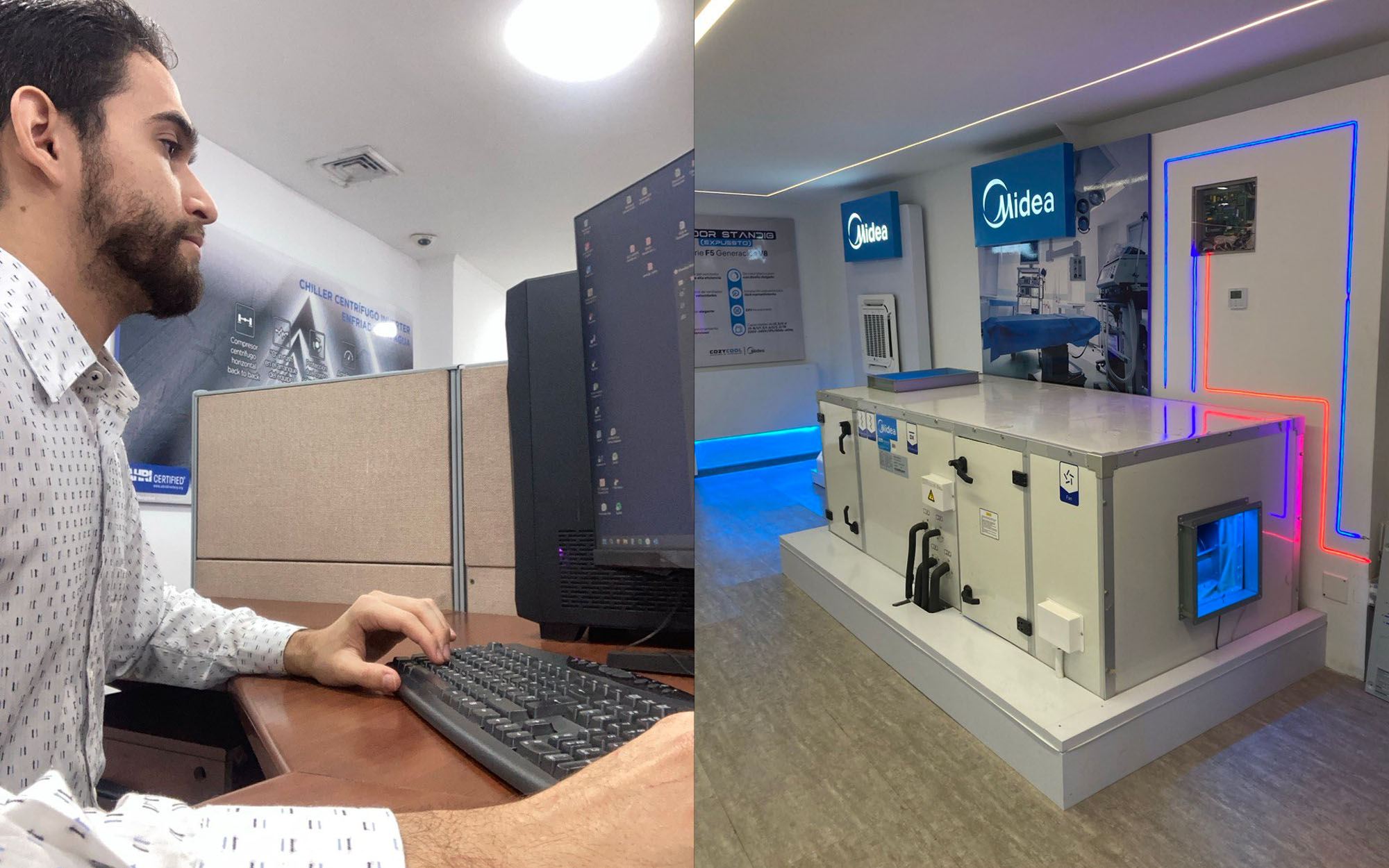 Figura Nº 2. A la izquierda, Una foto aleatoria atendiendo solicitudes de proyectos en mi puesto de trabajo. En la imagen derecha una Unidad Manejadora de Aire marca Midea.