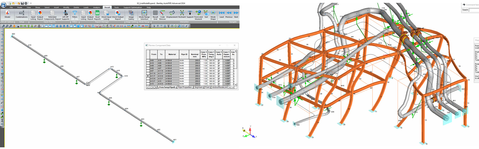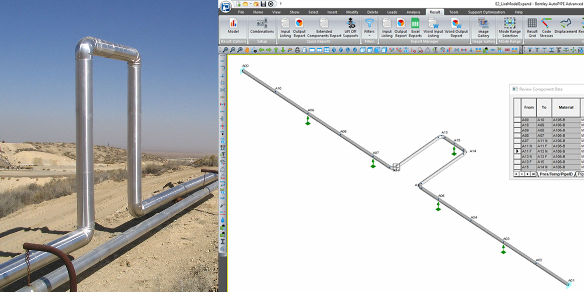 Figura Nº 1. Ejemplo de aplicación y modelado computacional de Bucles de Expansión en sistemas de tuberías (imagen izquierda cortesía de Milbury, M., Ratzlaff, J. e imagen derecha de producción propia con el software AutoPIPE).