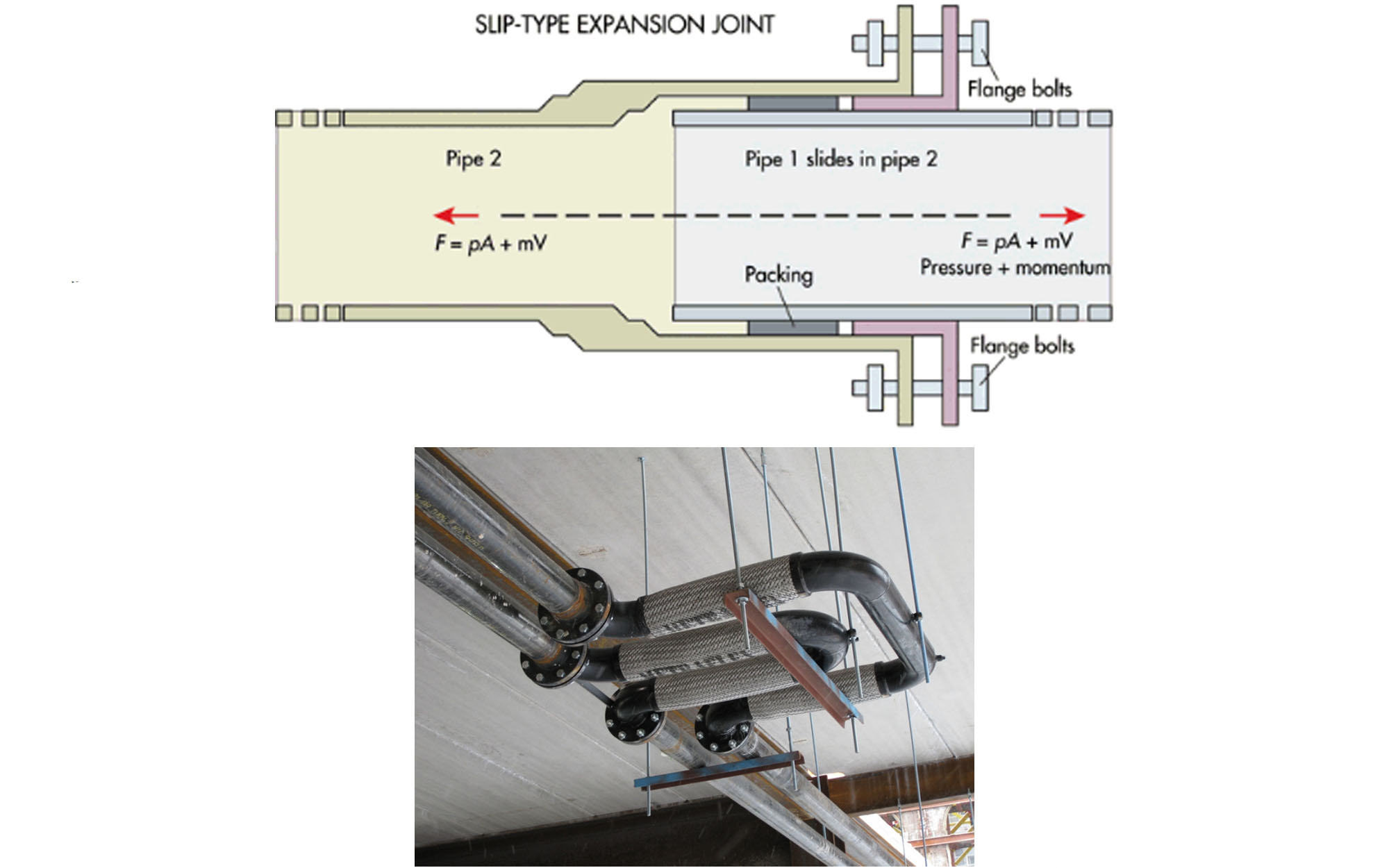 Figura Nº 4. Imagen Superior: Diagrama longitudinal de una Junta Metálica de Deslizamiento Axial indicando sus partes caracterisitcas (imagen cortesía de Singh, K.). Imagen Inferior: Arreglo de tuberias con multiples bucles de expansion en paralelo (imagen cortesía de Buildipedia Staff).